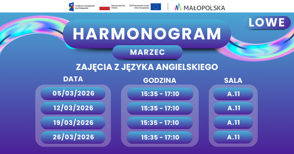 Marcowe zajęcia z języka angielskiego 💬🗣️ Pełny harmonogram zajęć dostępny na stronie. Wspólnie przełamujemy bariery językowe ✨😍 Projekt „Ośrodek Wiedzy i Edukacji przy Zespole Szkół Nr 1 w Olkuszu” realizowany w ramach programu Fundusze Europejskie dla Małopolski 2021-2027 Priorytet 6 Fundusze europejskie dla rynku pracy, edukacji i włączenia społecznego, Działanie 6.13 Lokalne inicjatywy edukacyjne, typ […]