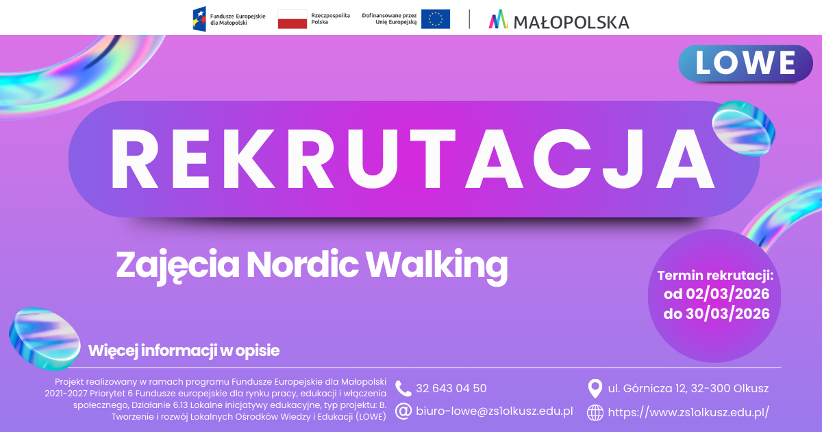 Projekt „Ośrodek Wiedzy i Edukacji przy Zespole Szkół Nr 1 w Olkuszu” realizowany w ramach programu Fundusze Europejskie dla Małopolski 2021–2027, Priorytet 6 Fundusze europejskie dla rynku pracy, edukacji i włączenia społecznego, Działanie 6.13 Lokalne inicjatywy edukacyjne, typ projektu: B. Tworzenie i rozwój Lokalnych Ośrodków Wiedzy i Edukacji (LOWE).
